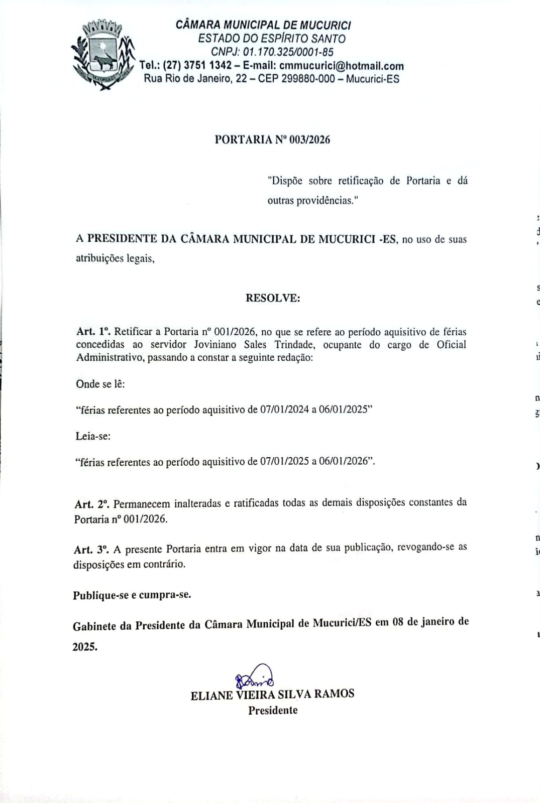 | PORT Nº 003/2026 - Portaria Interessado: Assunto: DISPÕE SOBRE A RETIFICAÇÃO DA PORTARIA E DA OUTRAS PROVIDÊNCIAS. Texto Integral |