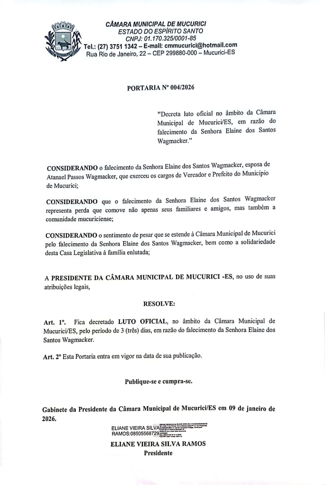 | PORT Nº 004/2026 - Portaria Interessado: Assunto: DECRETA LUTO OFICIAL ÂMBITO DA CÂMARA MUNICIPAL DE MUCURICI/ES, EM RAZÃO DO FALECIMENTO DA SENHORA ELAINE DOS SANTOS WAGMACKER. Texto Integral |